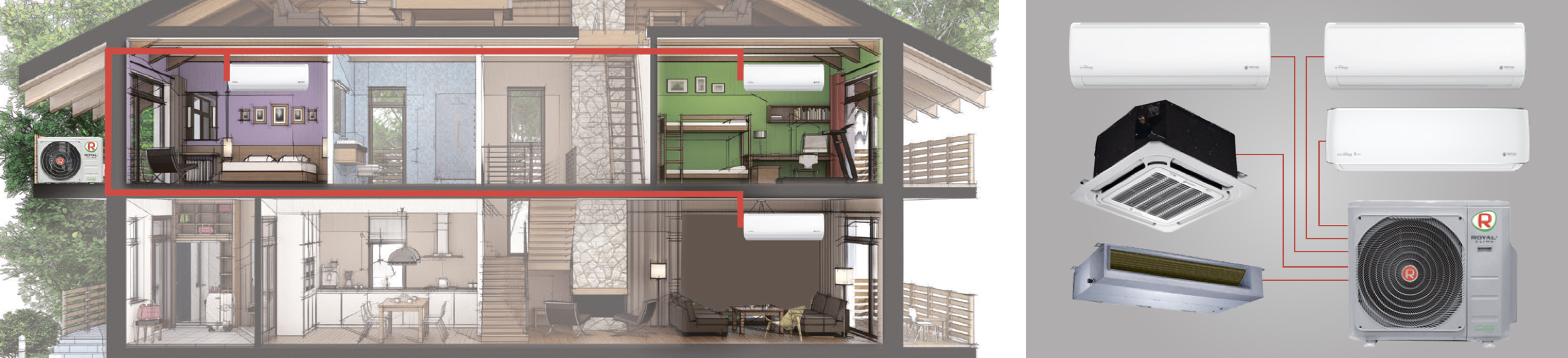 Общая площадь охлаждения до 40 кв.м, комбинации внутренних блоков подбираются индивидуально.