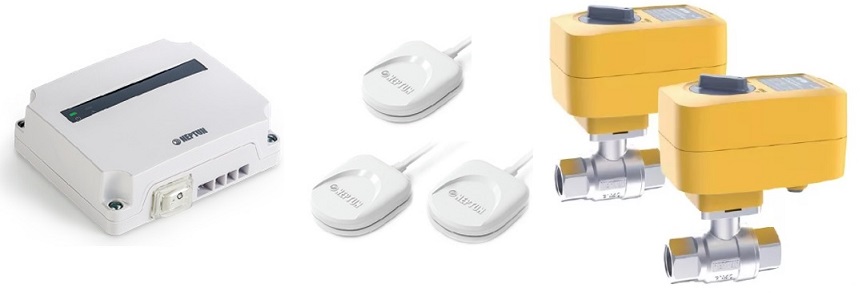Система защиты от протечки воды Neptun Profi Base 3/4 с проводными датчиками и кранами на 220 вольт. Датчики обнаружения воды устанавливаются в месте ее возможного появления. При срабатывании датчик подает сигнал на модуль с обозначением места протечки, а модуль перекрывает подачу воды с помощью кранов с электроприводом.