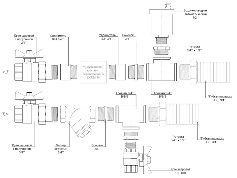 ** При необходимости комплект для обвязки можно дополнить двухходовым клапаном с сервоприводом EXT 2d 1/2, подключение которого выполняется с помощью двух удлинителей и бочонка. В противном случает удлинители и бочонок не используются.
