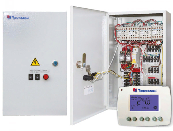 • Стандартная комплектация: тепловентилятор + проводной пульт HL10 с электронным термостатом — поддержание заданной температуры осуществляется за счет включения/выключения вентилятора и его работы на выбранной скорости. При достижении необходимого уровня температуры вентилятор отключается, теплоноситель продолжает циркулировать.