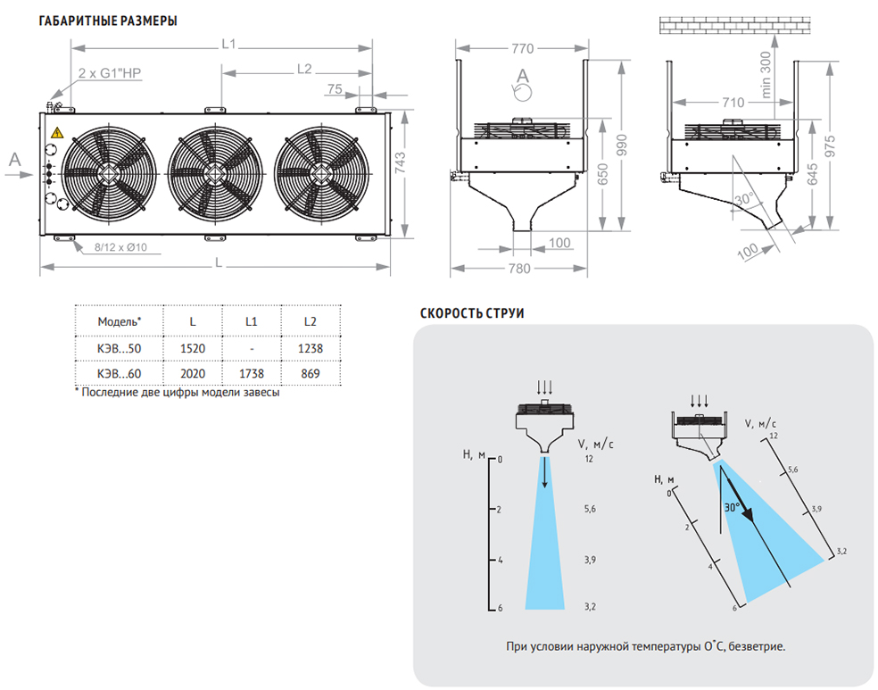 Эффективная длина струи может служить оценкой допустимой ширины или высоты проема, который защищает завеса. При вертикальной установке завес с двух сторон проема, значение, следует понимать как полуширину. Параметр указан только для "мягких" наружных условий, т.е. температура воздуха не опускается ниже 0 °С, а скорость ветра не превышает 1м/с, приточно-вытяжная вентиляция сбалансирована. Любое ужесточение условий уменьшает эффективную длину струи на 50%.
