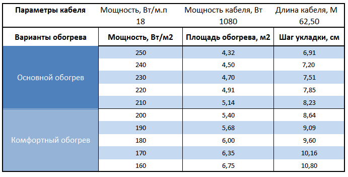 Площадь укладки при комфортном обогреве пола
