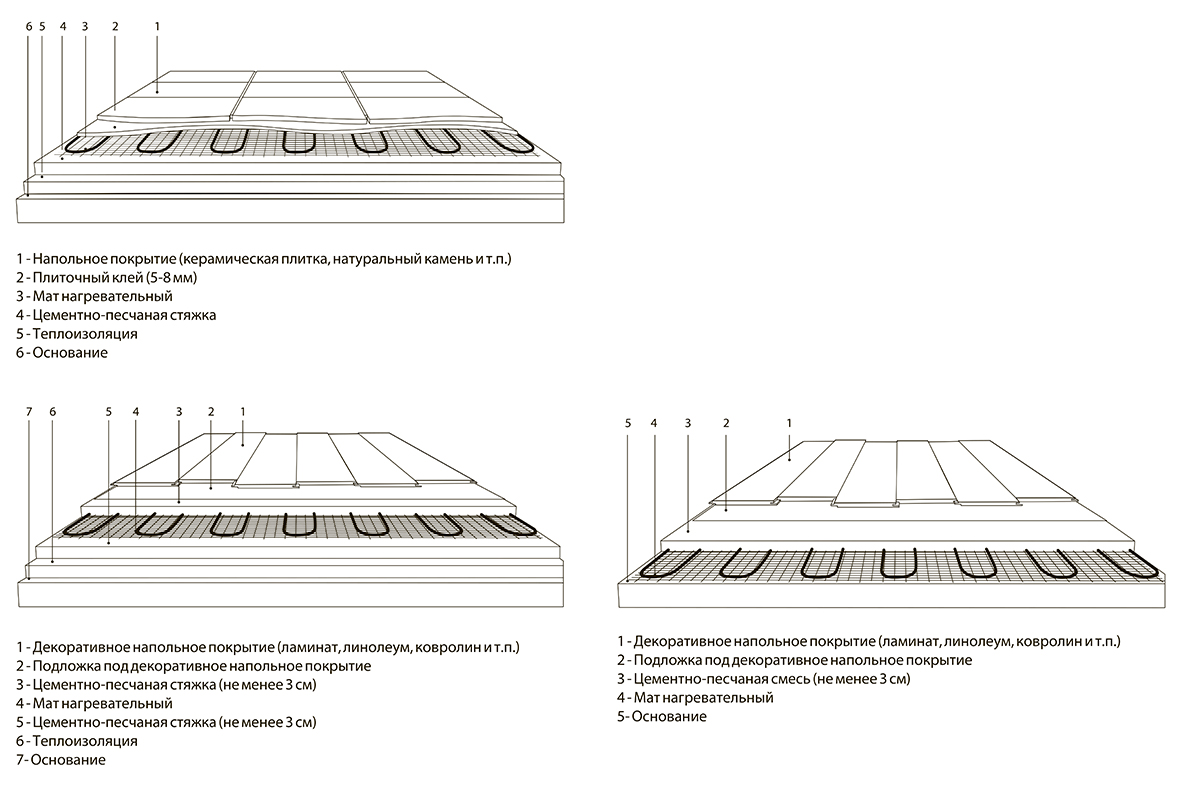 - Сечение кабеля около 3 мм — даёт возможность универсального размещения с укладкой как в стяжку, так и в слой плиточного клея, на пол или стену.